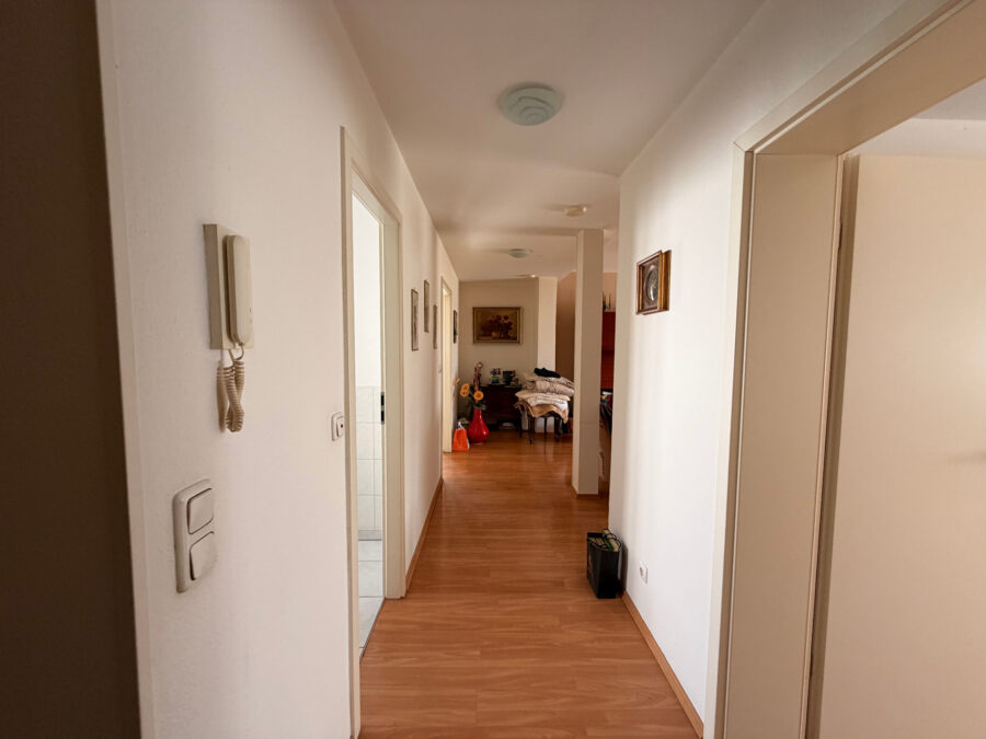 Ein zentral gelegener Flur verbindet alle Räume effizient miteinander und unterstreicht den durchdachten Grundriss der Wohnung.