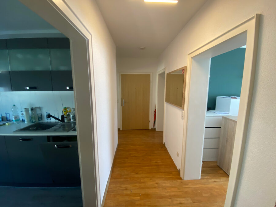 Sie betreten die helle 2-Zimmerwohnung über einen geräumigen Flur, der ausreichend Platz zum Empfangen von Gästen und genug Raum für eine Garderobe und einen Schuhschrank bietet.